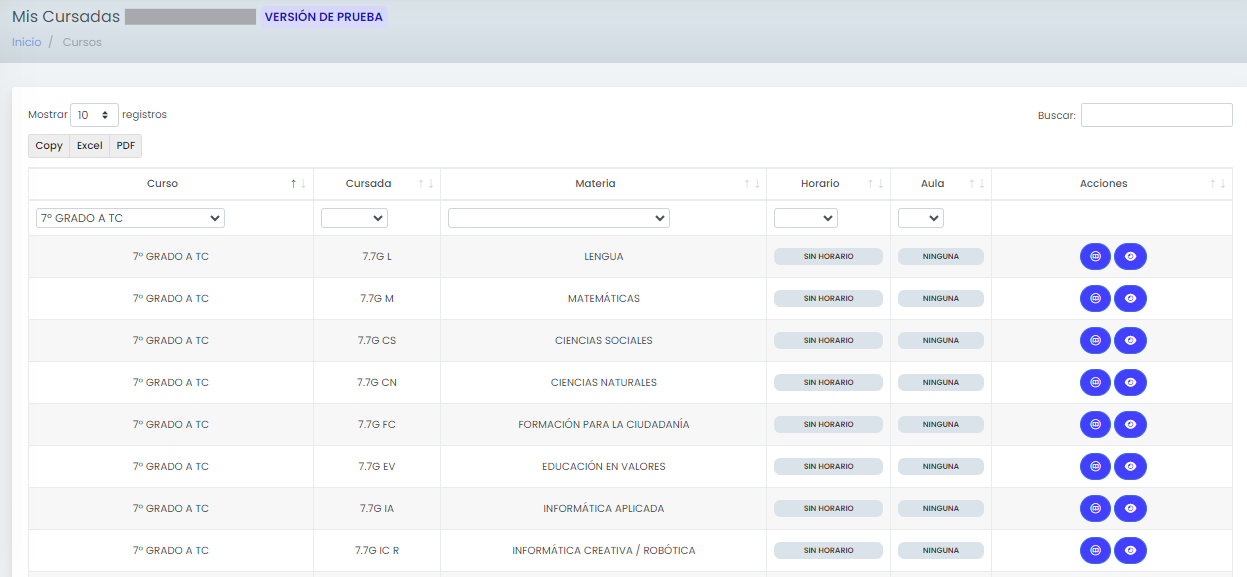 Desde allí se accede al listado completo de cursadas pertenecientes a los cursos que el preceptor tiene asignados.