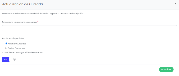Esta opción permite asignar o quitar cursadas específicas a los alumnos seleccionados.