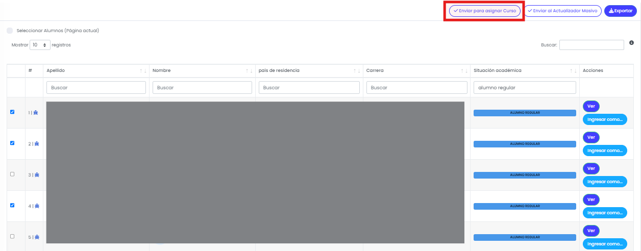 En esta pantalla es posible seleccionar uno o varios alumnos y aplicar acciones masivas sobre ellos.