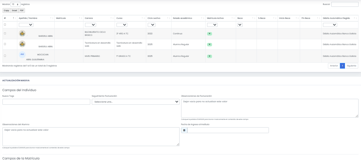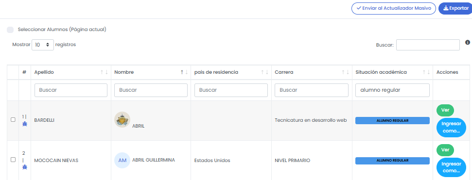 El sistema abrirá en una pestaña nueva, la pantalla de actualización masiva de alumnos, con el listado de alumnos seleccionados en la búsqueda ya precargados.