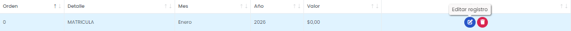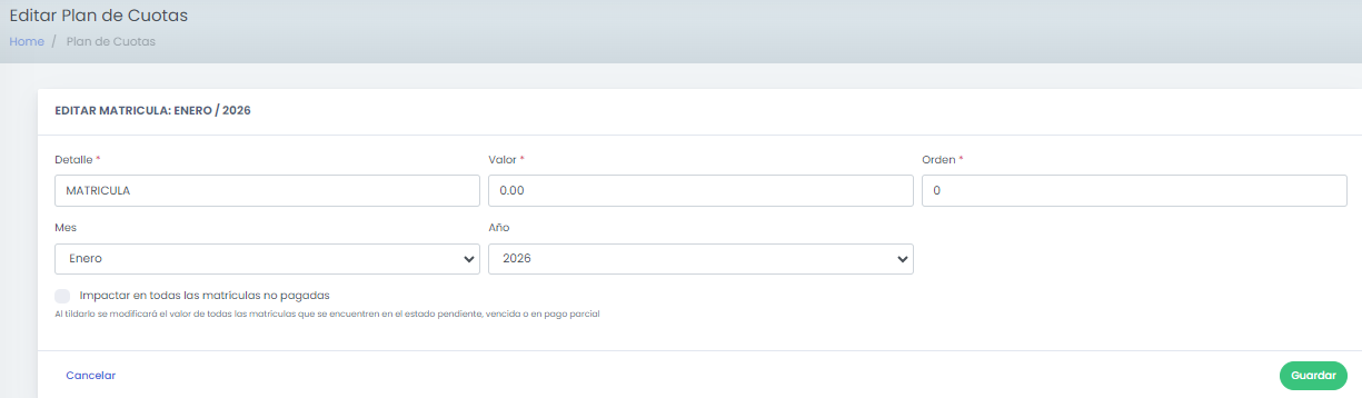 Desde esta pantalla podremos editar los valores u otros datos relacionados con la matrícula o las cuotas.