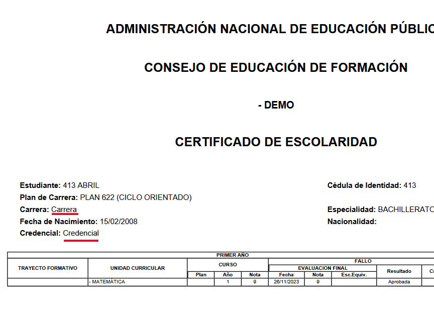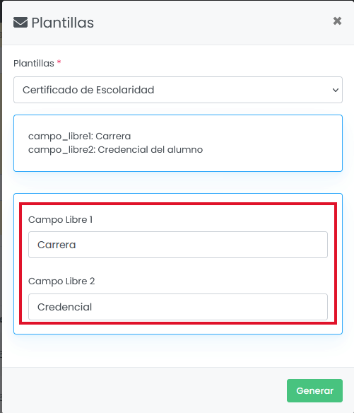 - Se nos abrirá una ventana en la cual debemos elegir el Certificado de Escolaridad y además completar los 2 campos Libres, los cuales se reemplazaran por los datos Carrera y Credencial.