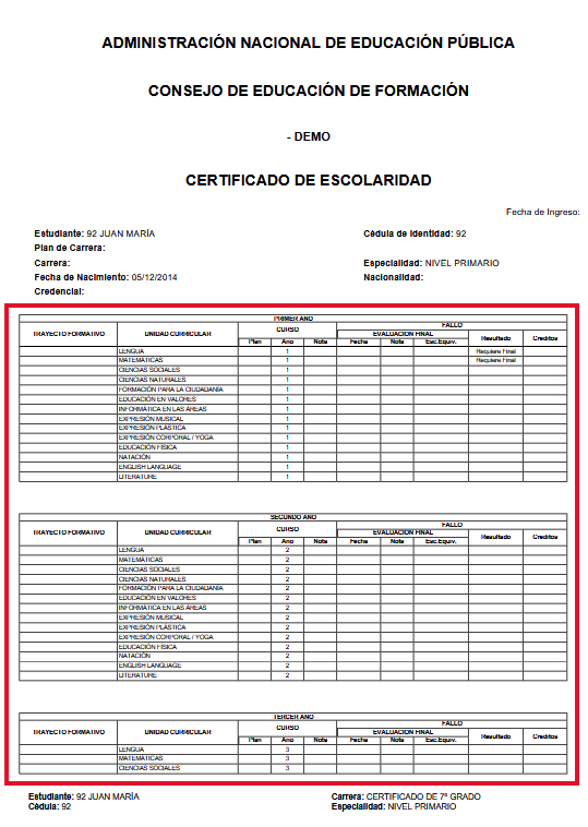 - Resumen del historial académico discriminado por año.