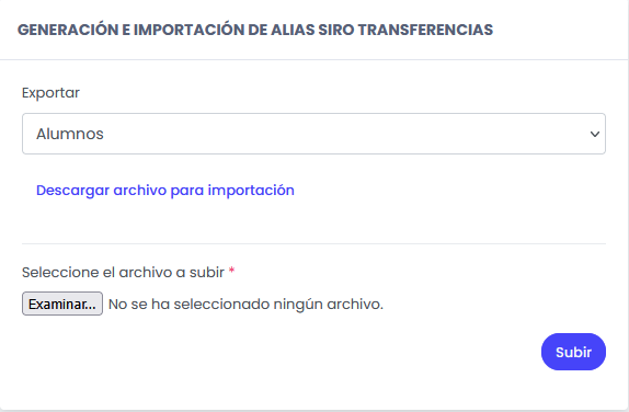 Esta funcionalidad permite importar el archivo de respuesta enviado por el banco para registrar los alias asociados a cada persona dentro del sistema.