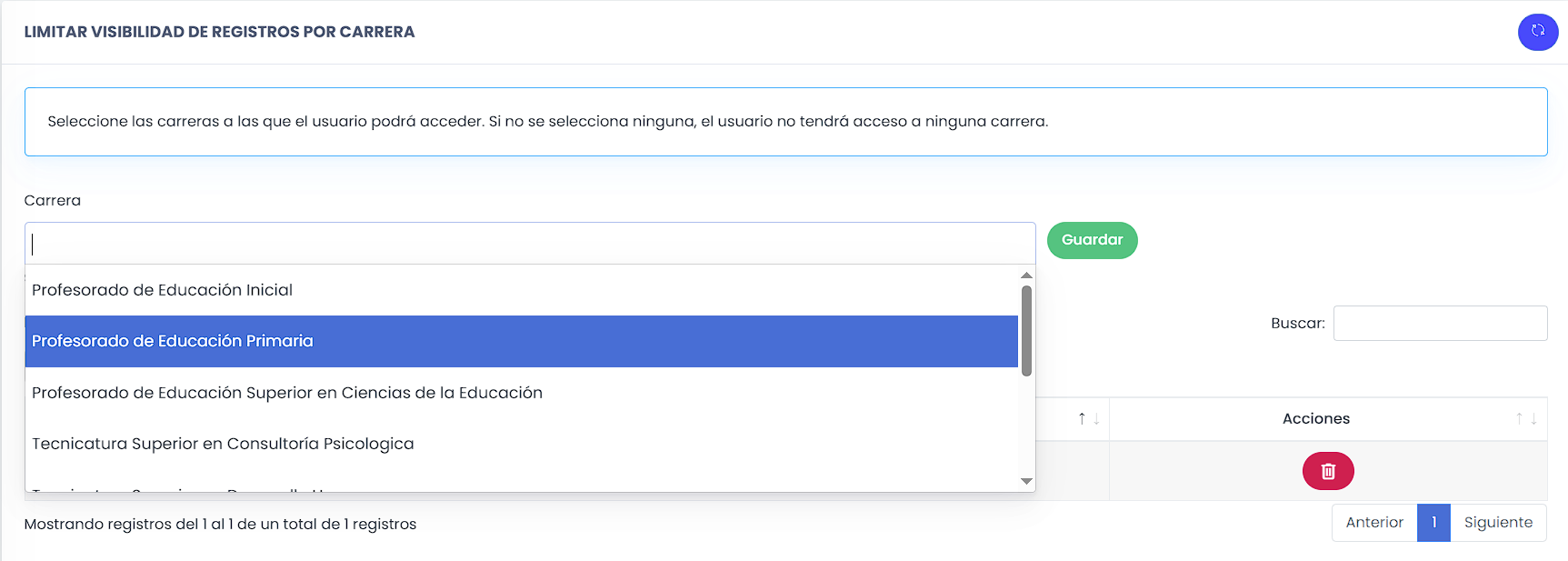 Si no se selecciona ninguna Carrera, el usuario no tendrá acceso a ninguna Carrera.