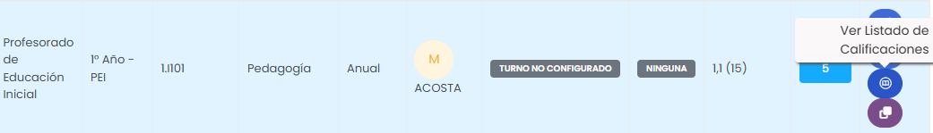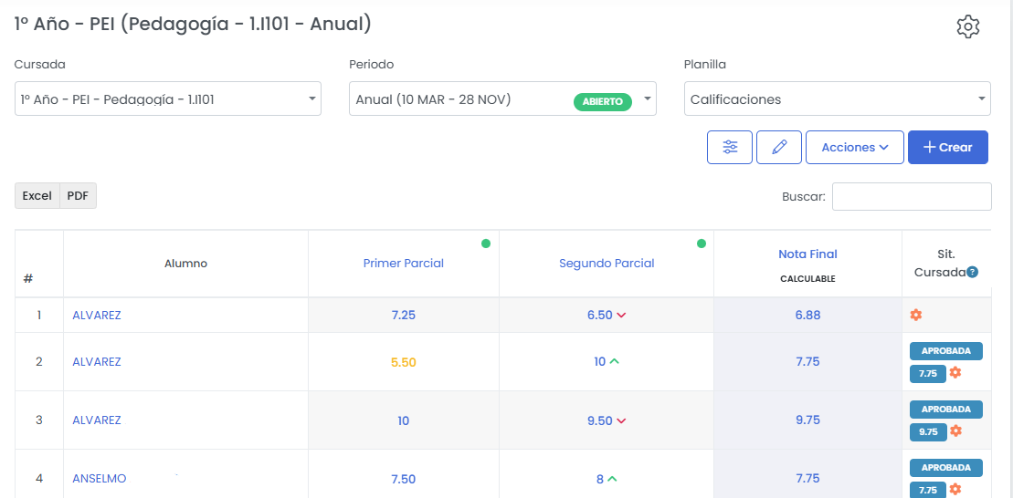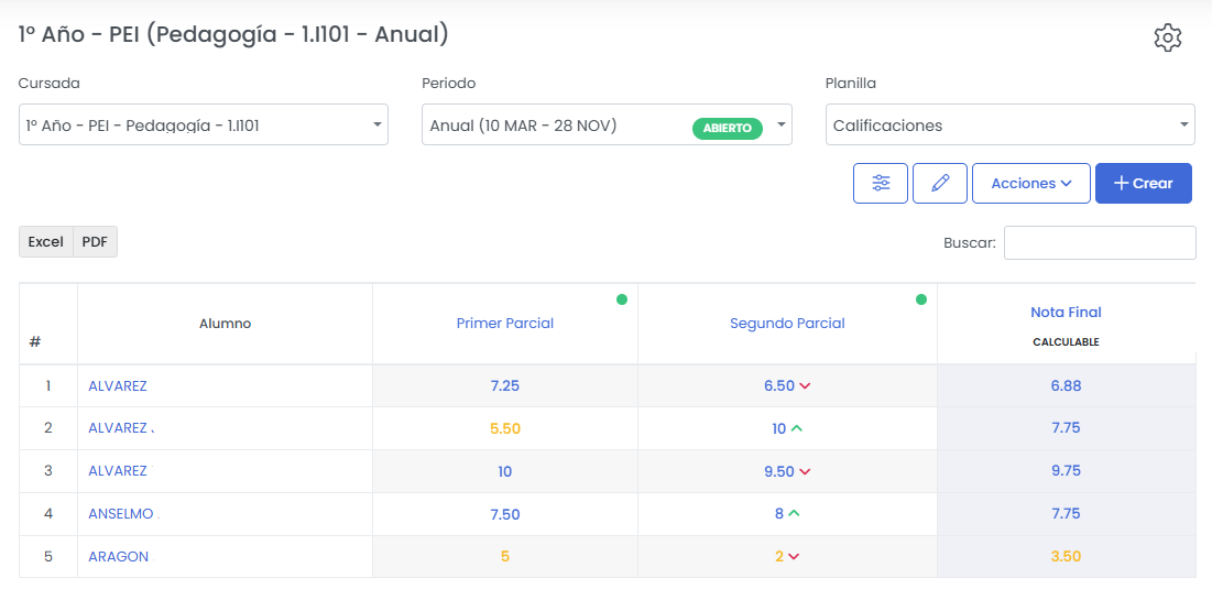Esta pantalla muestra todas las instancias evaluativas de una materia para un mismo grupo de alumnos y permite verificar el estado de publicación mediante un sistema de colores o “semáforo”.