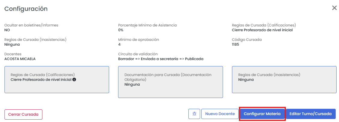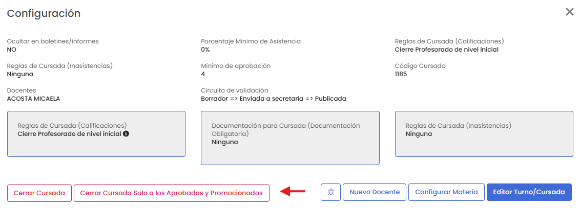 Ambas reglas se configuran desde la pantalla de configuración de la cursada y se aplican automáticamente durante el proceso de cierre.