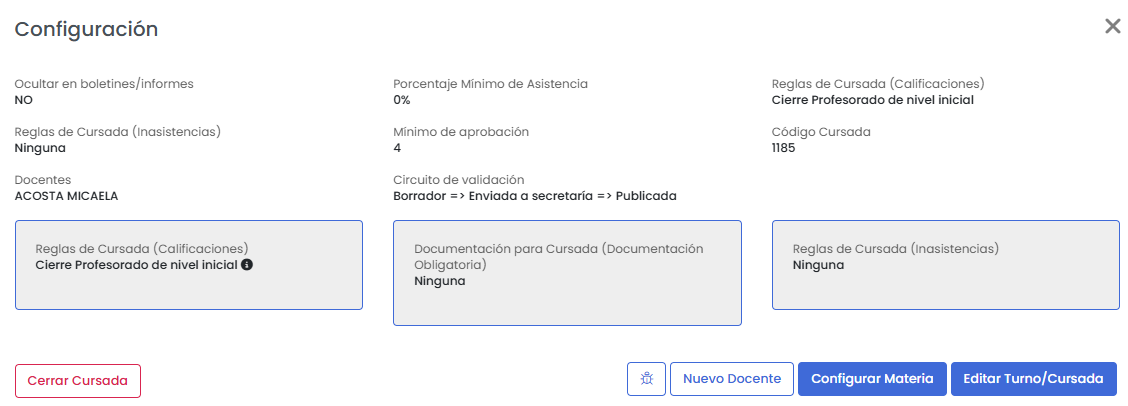 💡 Sugerencia: no modificar las reglas de cursada mientras el ciclo está en curso. Si se necesitan cambios, realizarlos antes del inicio o después del cierre, para evitar inconsistencias en las calificaciones.