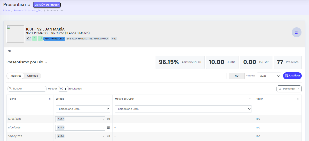 Esta funcionalidad organiza la información de asistencia dentro de la ficha del alumno para facilitar su lectura y seguimiento.