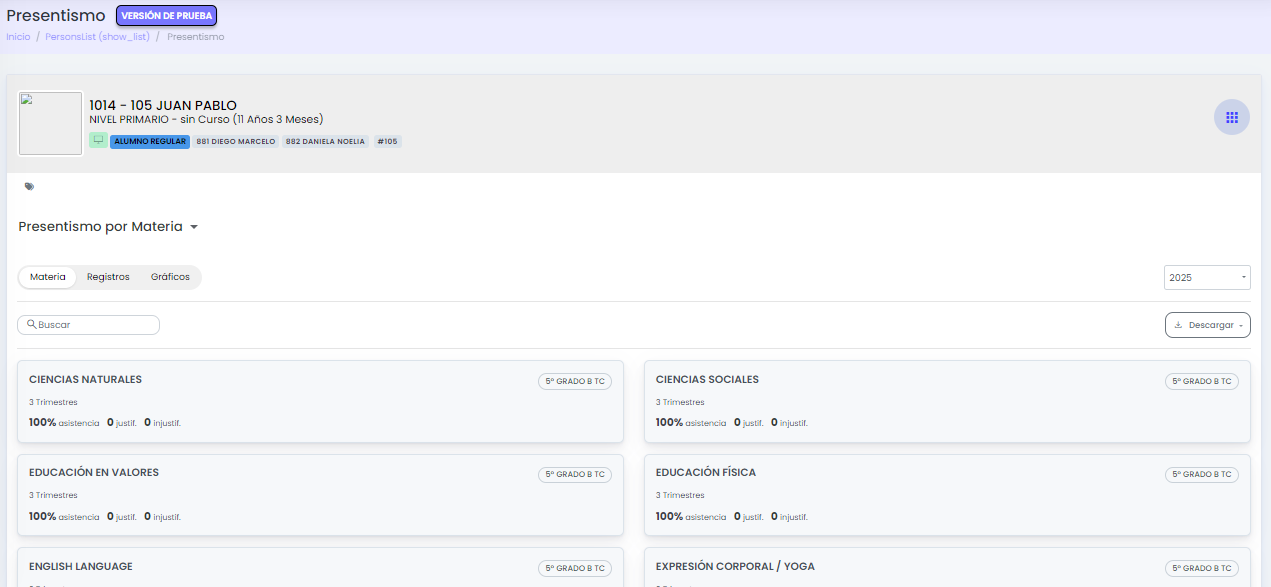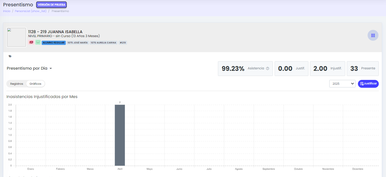 La solapa permite consultar presentismo por día y por materia, junto con indicadores, registros, gráficos e inasistencias justificadas.