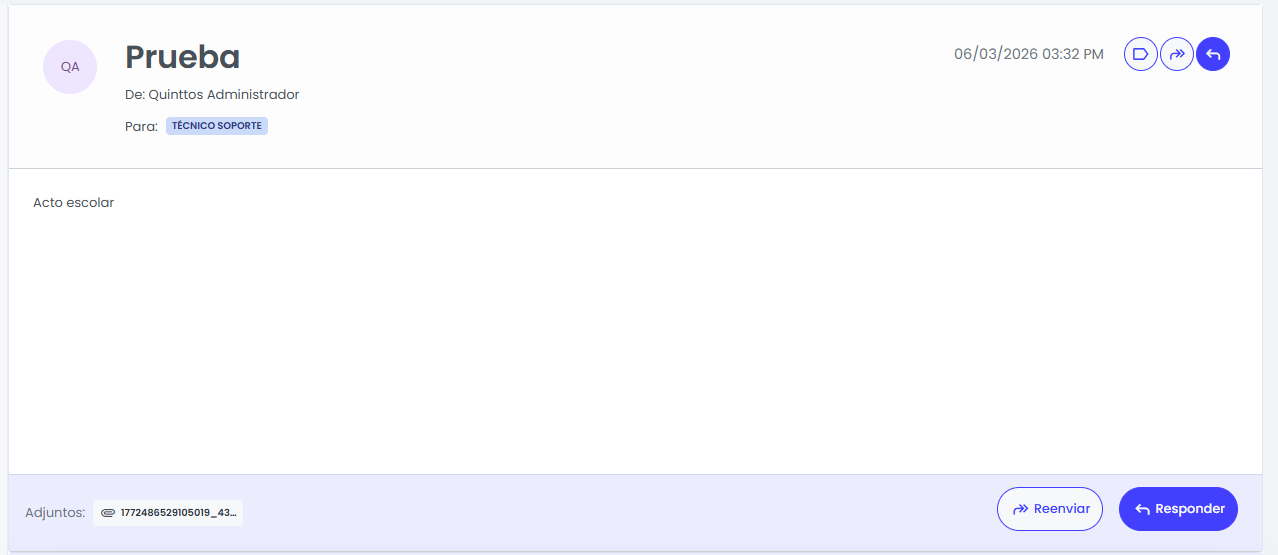 Desde esta pantalla se puede consultar la información del mensaje, acceder a archivos adjuntos y realizar acciones según el rol del usuario.