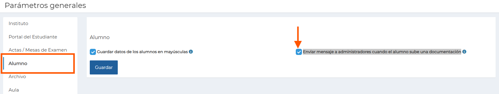 "Enviar mensaje a administradores cuando el alumno sube una documentación":