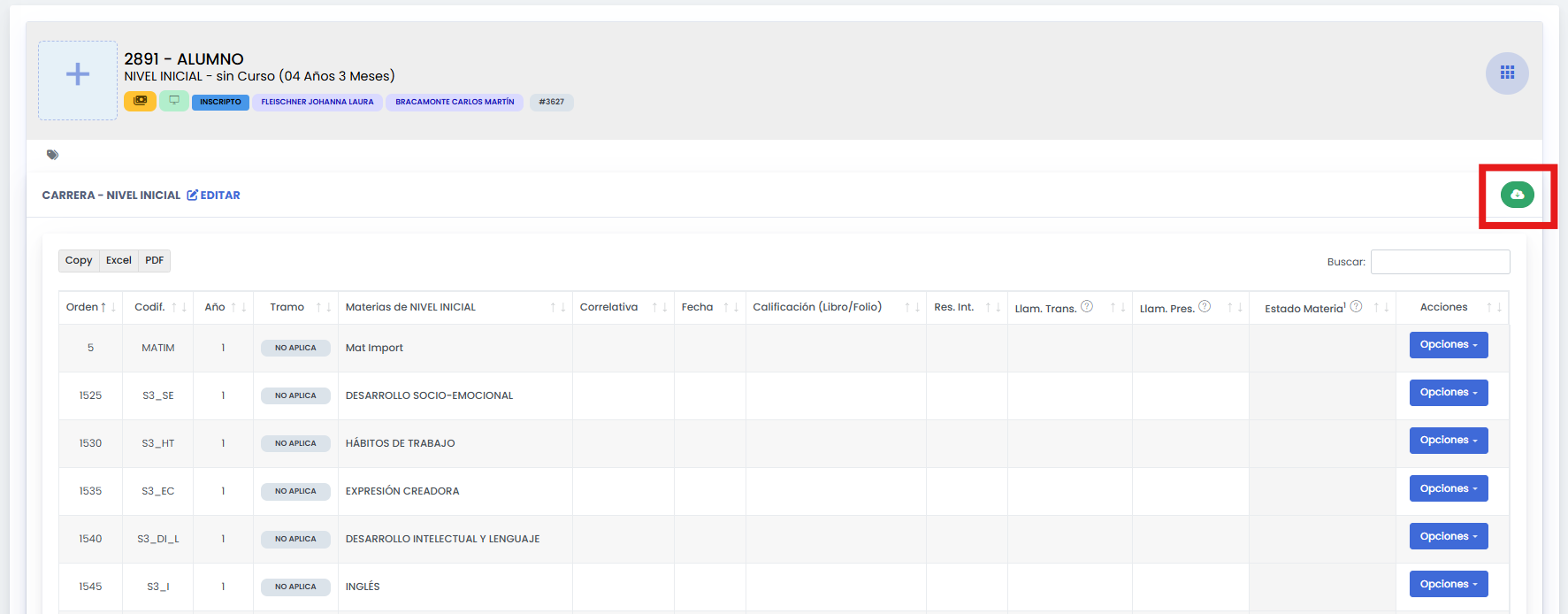 Descargar un archivo con todas las materias de un estudiante y su estado académico.