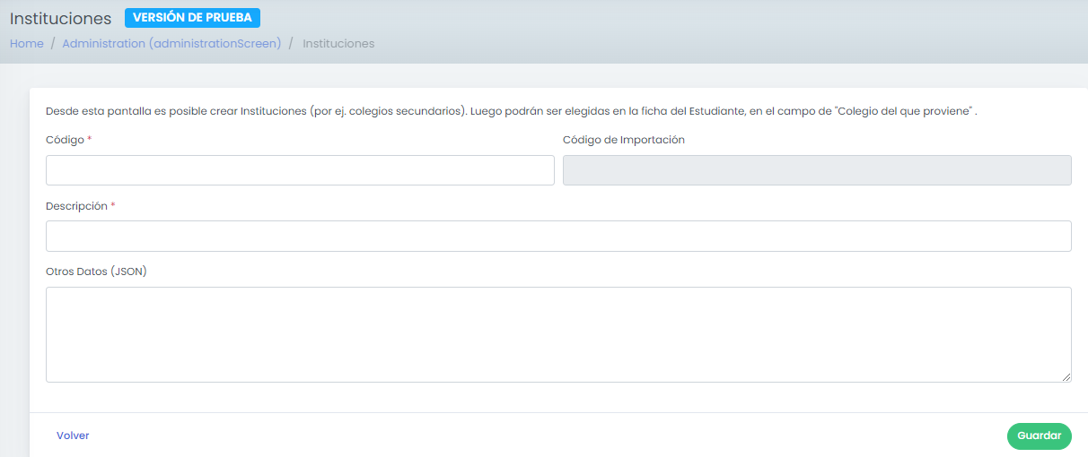 La carga de Instituciones permite administrar y reutilizar información institucional en distintas áreas del sistema (alumnos, formularios y procesos masivos), garantizando que los datos se carguen de forma uniforme, validada y sin errores de escritura.