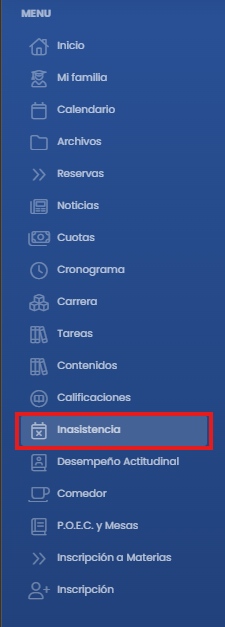 Dentro del Portal del Responsable, seleccionando el perfil del alumno y dirigiéndose a la barra lateral izquierda -> Inasistencia