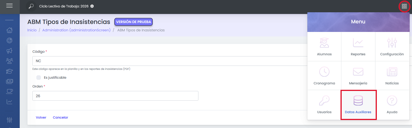 Para ellos ingresamos a Datos Auxiliares -> Tipos de Inasistencias.