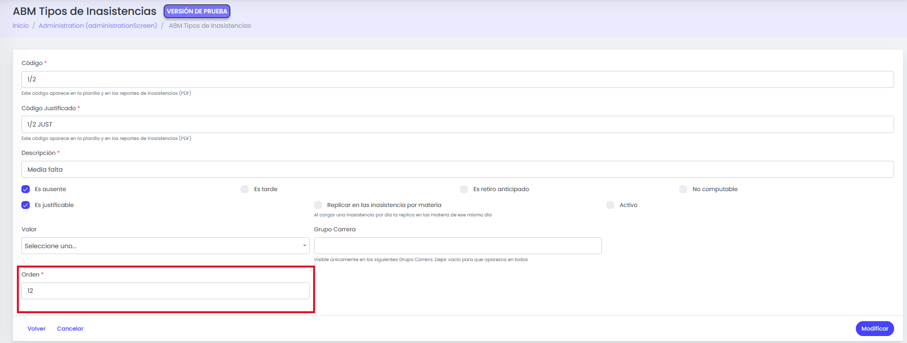 Al ingresar a la siguiente pantalla, vamos a poder crear/editar un tipo de inasistencias, y en la parte inferior agregar el orden en el que se coloque dicho tipo en el listado.