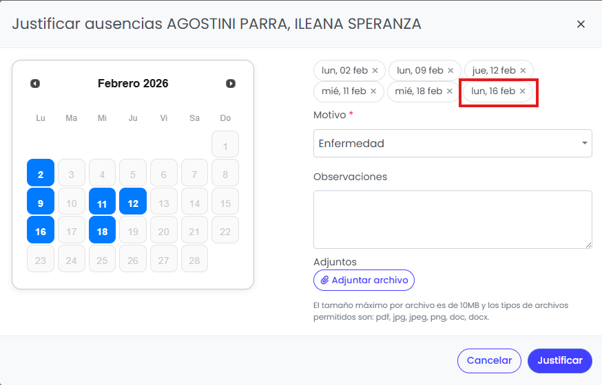 Hacer clic en Justificar, lo que abre el calendario para seleccionar fechas.