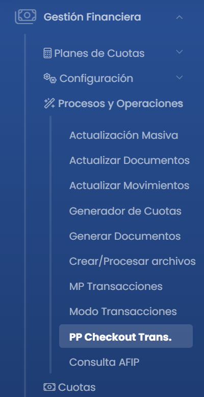 Desde el menú lateral, Procesos y operaciones, finalmente, PP Checkout trans.