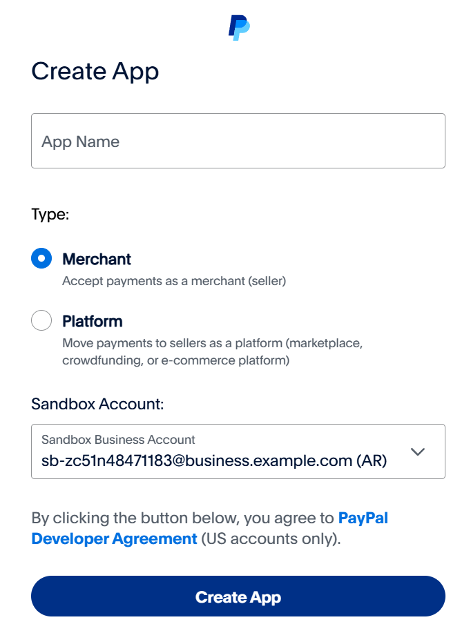 PayPal mostrará el siguiente recuadro. Se debe completar el nombre de la aplicación, por ejemplo, "integracion quinttos" (No admite caracteres especiales, como acentos). Luego, Tipo y cuenta, dejar por defecto.