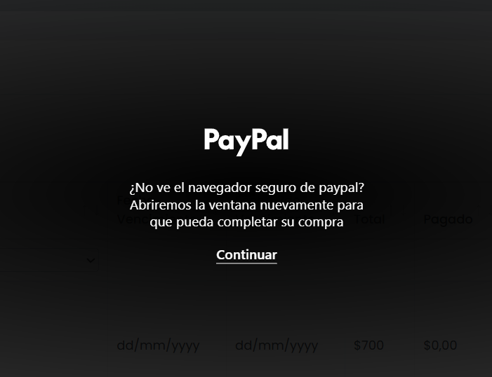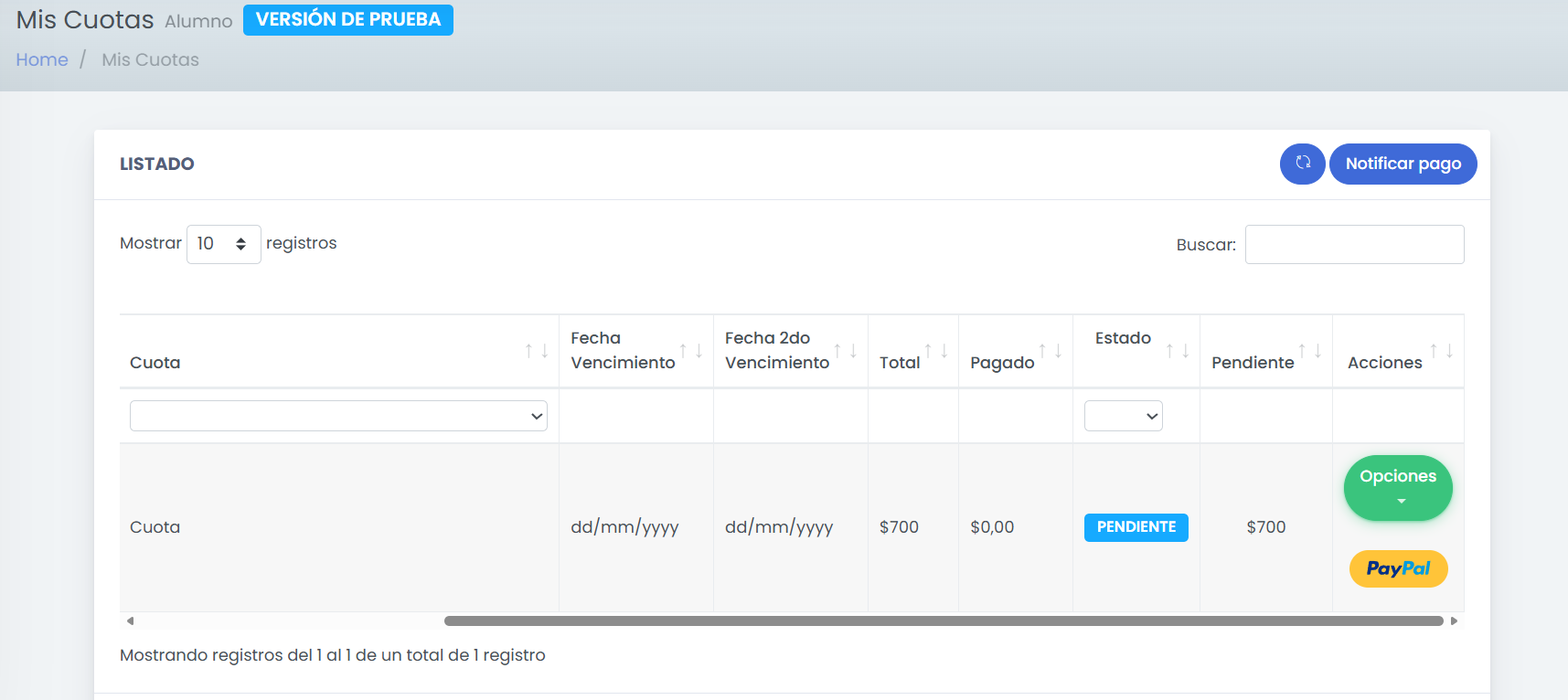 Una vez que el equipo de soporte o implementaciones haya configurado el medio de pago, desde la pantalla de "Mis cuotas" dentro del portal del alumno, se observará el botón de PayPal CheckOut.