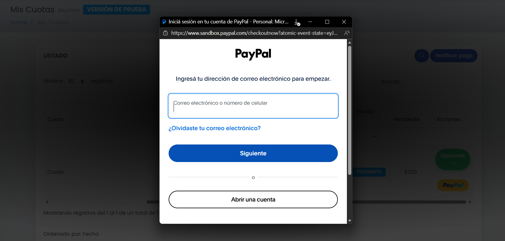 Cuando el alumno haga clic en el botón, se le solicitará que ingrese a su cuenta de PayPal.