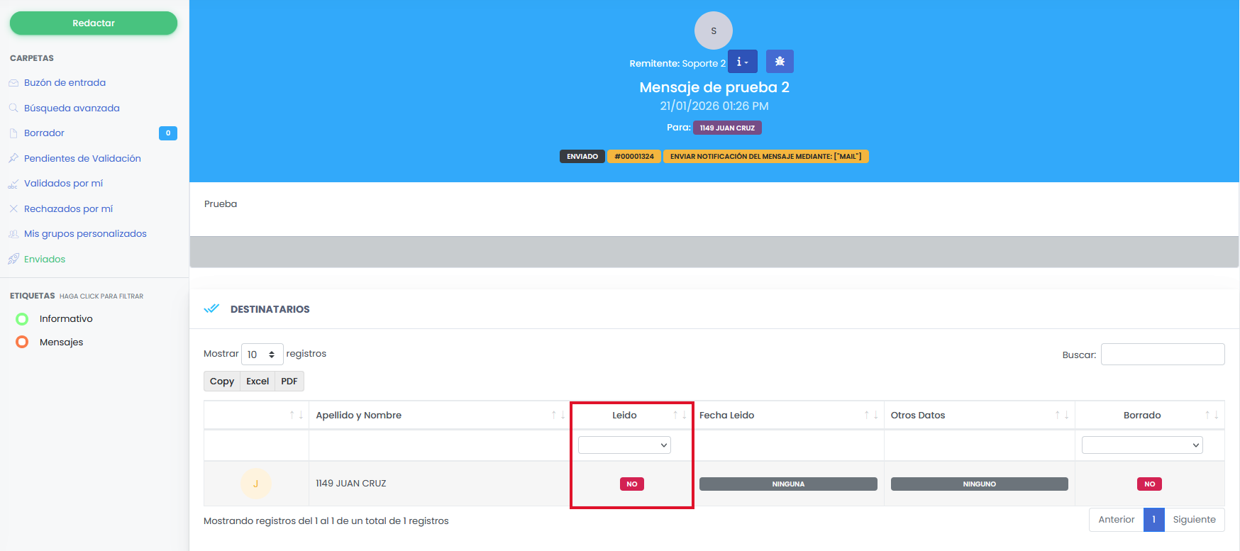 El sistema nos mostrará un listado con la cantidad de destinatarios que visualizaron el mensaje.