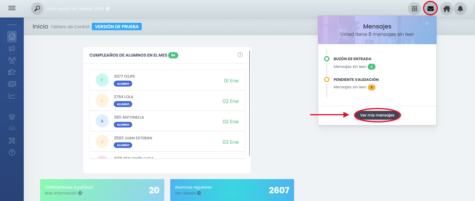 Validar Mensajes de Docentes El sistema permite activar un flujo de validación de mensajes. Al habilitar esta función, un administrador deberá revisar y aprobar los mensajes enviados por los docentes antes de que lleguen a su destinatario (ya sean ...
