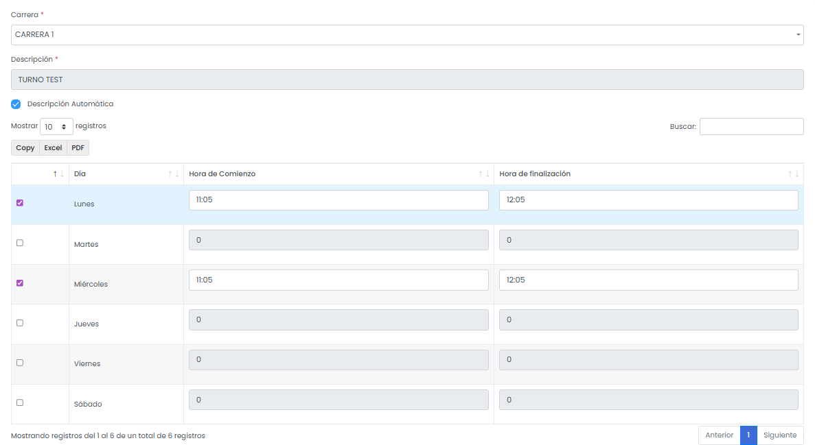 El sistema muestra el listado de Turnos ya configurados.