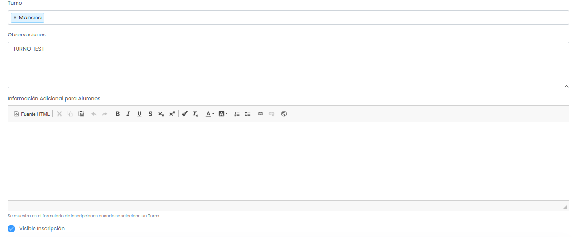 Visible Inscripción: Indica si el turno se debe mostrar o no el formulario de inscripciones para la inscripción elegida en el campo "Inscripción asociada".