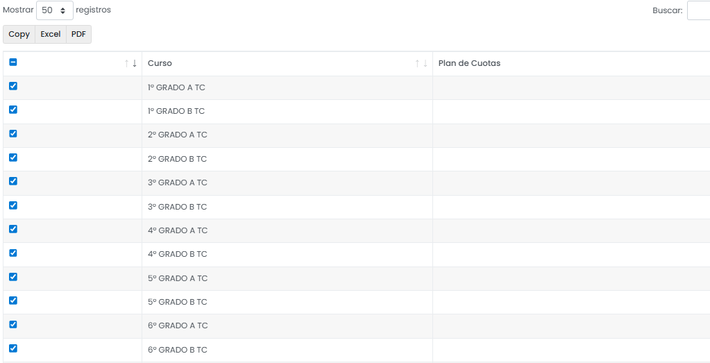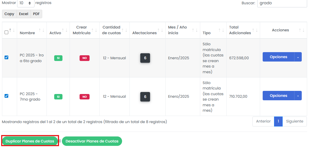 Seleccionamos los planes de cuotas que vamos a utilizar para el año siguiente y le damos al botón de duplicar planes de cuotas