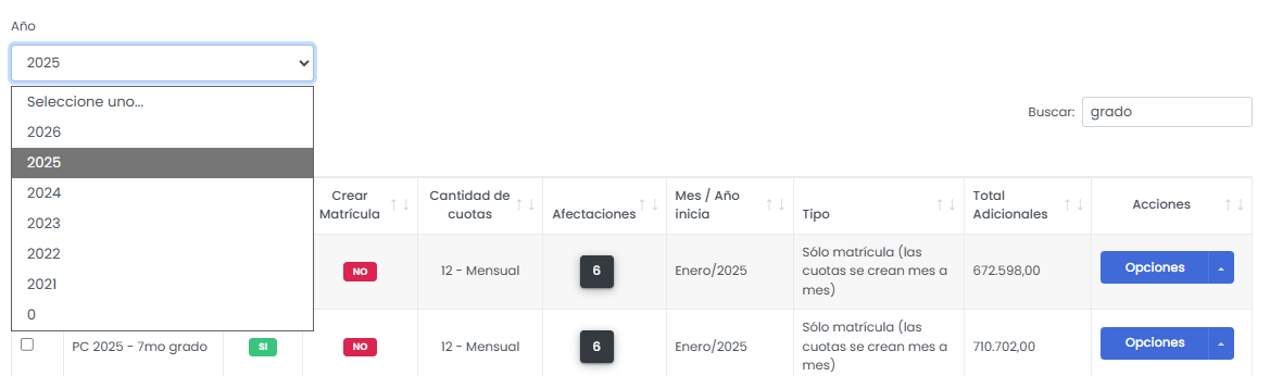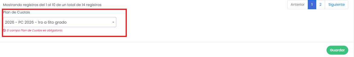 Ahora para continuar configurando estos planes de cuotas vamos a cambiar el año de los planes de cuotas mostrados en el sistema