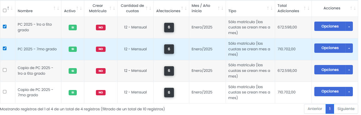 IMPORTANTE: Si no vamos a utilizar estos planes de cuotas en el ciclo siguiente podemos omitir la duplicación de estos planes de cuotas y crearlos directamente en el ciclo siguiente