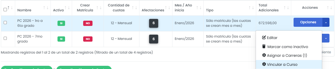 Seleccionamos los cursos que deseemos que estén vinculados a este plan de cuotas