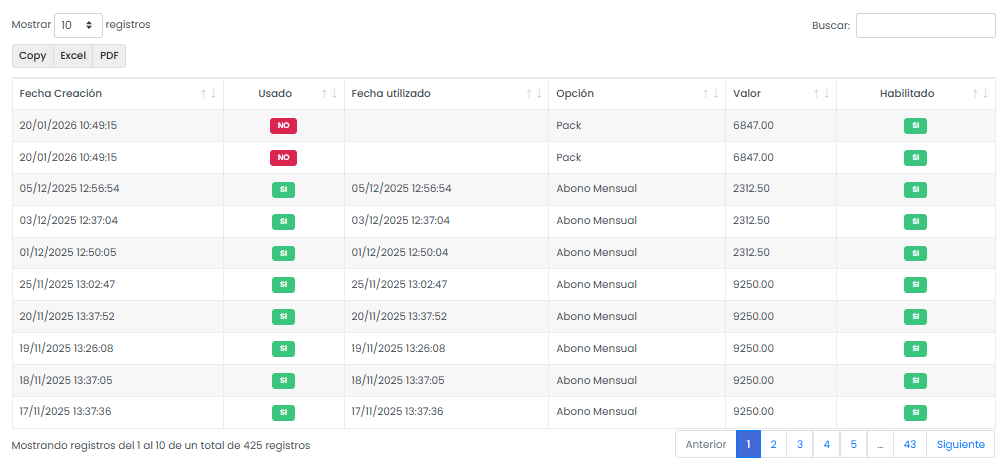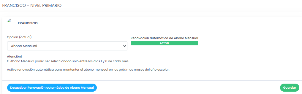 Si se tenía seleccionada la opción Abono Mensual y se cambia a Post-Pago, el sistema automáticamente marcará la Renovación Automática de Abono Mensual como Inactiva.