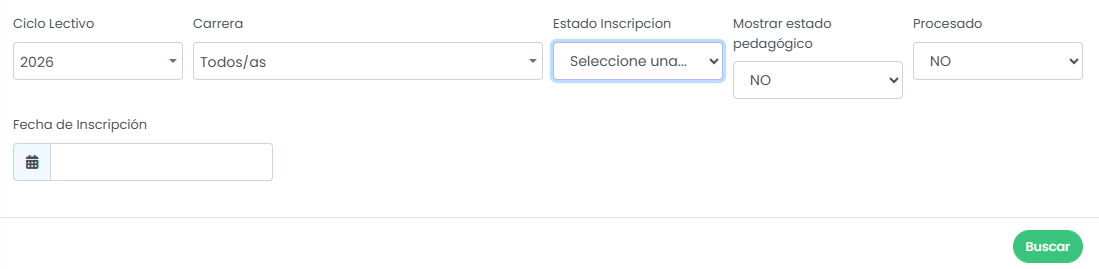 Al ingresar al módulo, veremos inicialmente un buscador, el cual nos permitirá realizar búsquedas más específicas de las inscripciones si fuese necesario.
