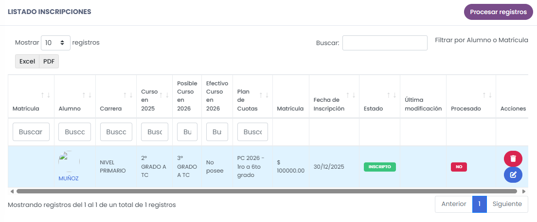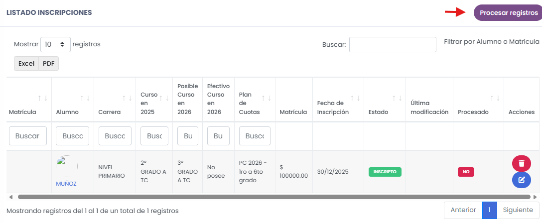 Para realizar este procedimiento debemos seleccionar el botón de Procesar registros ubicado en el modulo de inscripciones anteriormente mencionado