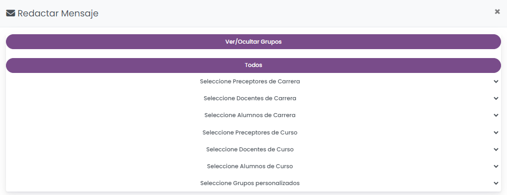Esto nos muestra un listado de las opciones disponibles y lo que nos permite, por ejemplo, tener como destinatario a "Todos los alumnos de un curso" por ej. También se pueden seleccionar múltiples grupos o mezclar grupos con destinatarios de forma individual. Los destinatarios del mensaje se visualizan en la sección de "Para".