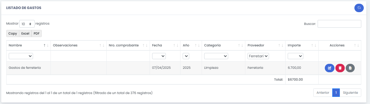 El Registro de Gastos permite cargar y administrar los gastos del instituto, asociándolos a una categoría, un proveedor y, si corresponde, a una cuenta del sistema.