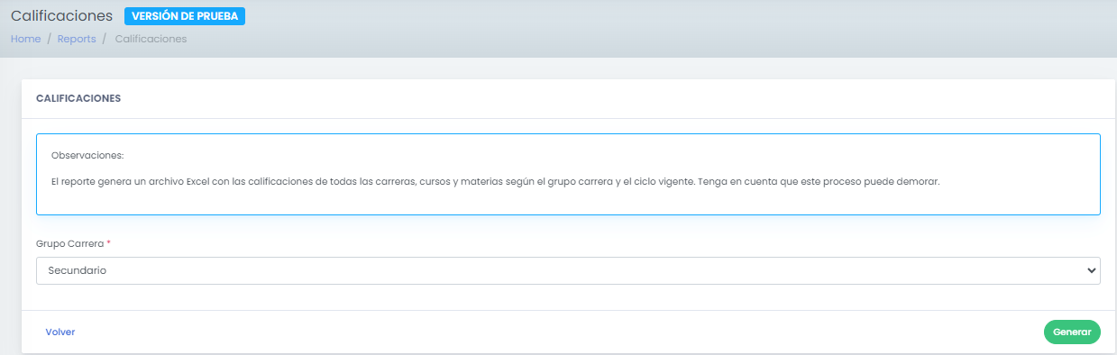 El Reporte de Calificaciones permite generar un archivo Excel con las calificaciones de todas las carreras, cursos y materias correspondientes a un grupo de carrera y al ciclo lectivo vigente.