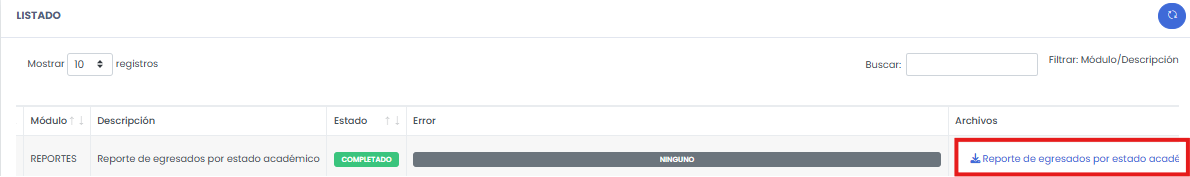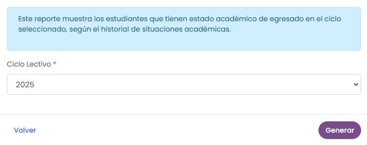 El reporte Egresados por Estado Académico permite obtener un listado de estudiantes que han finalizado una carrera o trayecto formativo, organizados según su situación académica registrada en el sistema.