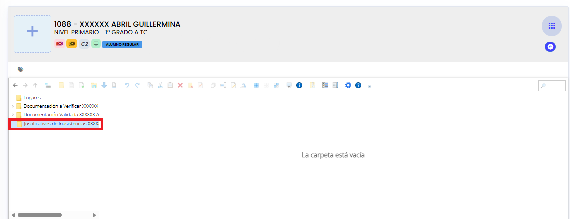 El sistema crea automáticamente una carpeta llamada "Justificativos de Inasistencias" que se suma a las carpetas habituales (Documentación Validada y Documentación a Validar).